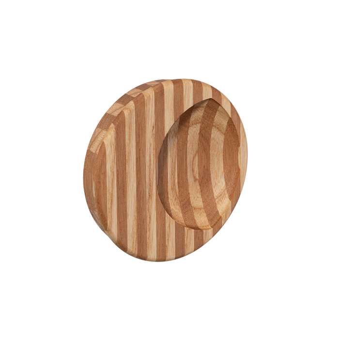 Set within a circular fixture, this sliding door pull is inset with a crescent moon, enabling fingers to snugly grasp its internal concave edge. Named after a streak of craziness, it alludes to the belief that the moon has the power to drive people to lunacy. Perfectly suited to pocket doors, it instantly animates any surface it adorns. Superbly crafted from solid timber species that span the globe, it is offered in three different striped colourways of contrasting natural tones that range in intensity from deep brown paired with blonde or an earthy red shade to more vibrant bands marrying rich aubergine and tangerine.