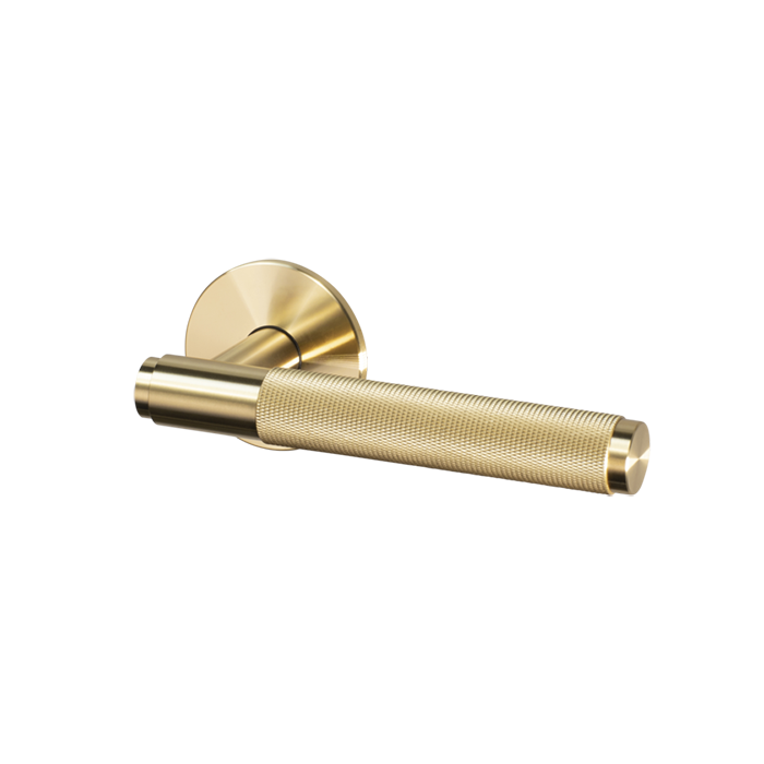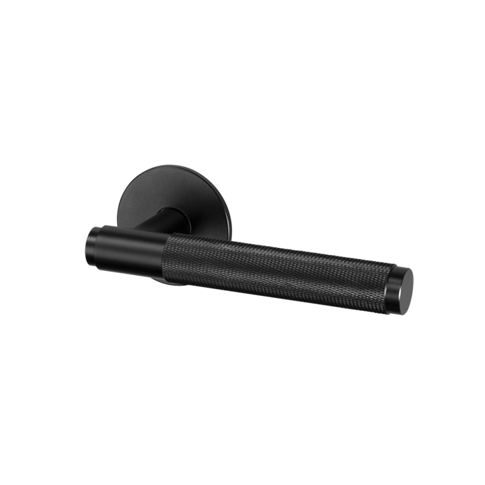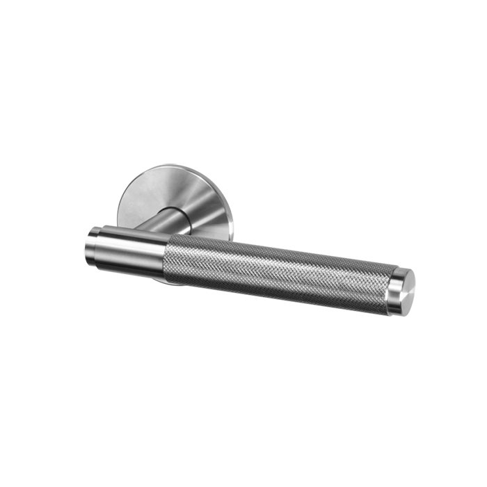 A door handle set made from solid metal. This door handle features the signature, diamond-cut, cross-knurl pattern and is refined by hand. Comes complete with a 60 mm backset privacy tubular latch with through bolt fixings.